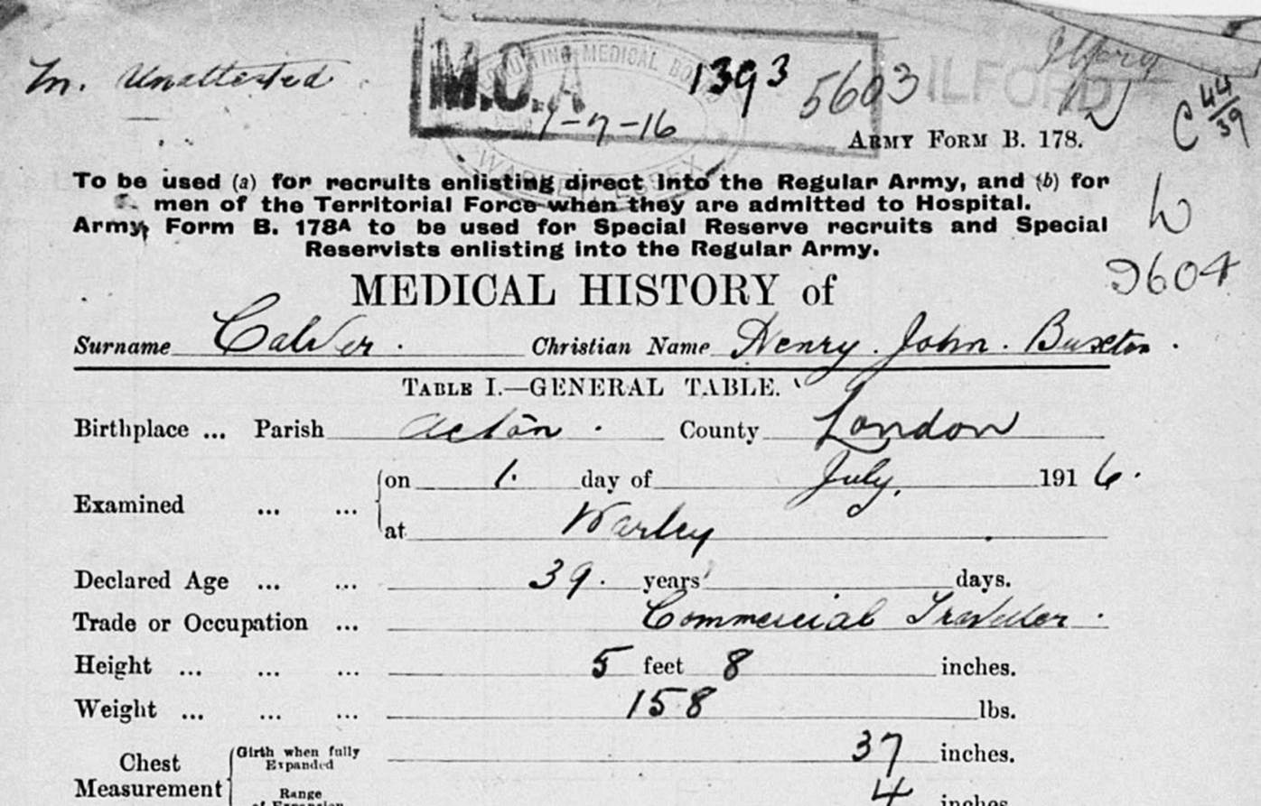 1st July 1916 – considered by many to be the worst day in British military history – was also the day that my grandfather, Harry John Buxton Calver, was found fit for service in the British Army.