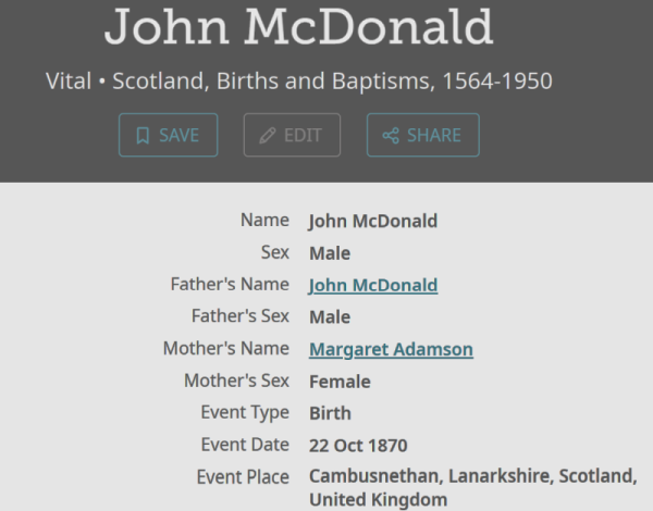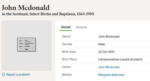 It’s interesting to compare the information provided by the 4 different sites for the same index entry. Everything I’ve shown is available free with the exception of the Ancestry entry, which – surprisingly – requires a subscription. I say “surprisingly” because I had always assumed that records provided free by FamilySearch to another site were free to all users of that site.