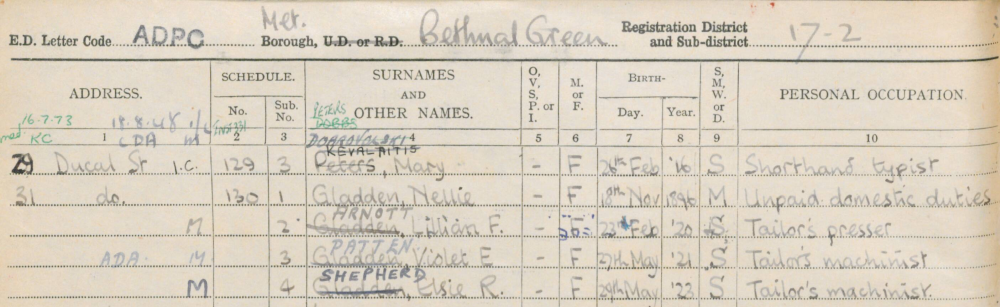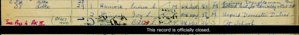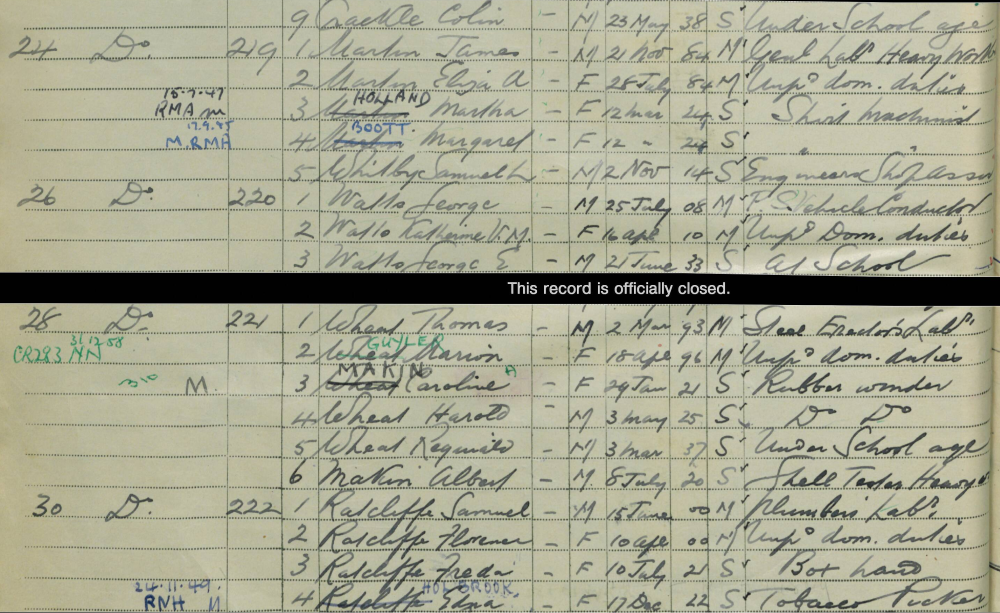 But also of passing interest is the entry for Caroline Makin, formerly Wheat. She married just months after the register was compiled and there’s just a solitary ‘M’ against the entry to indicate why the surname has changed. Contrast this with the entry for her widowed mother’s remarriage, which shows the number of the form (CR283); by this time the National Register had become the NHS Central Register, so the letters ‘CR’ could well stand for ‘Central Register’, and not ‘Civil Registration’ as one might have assumed.